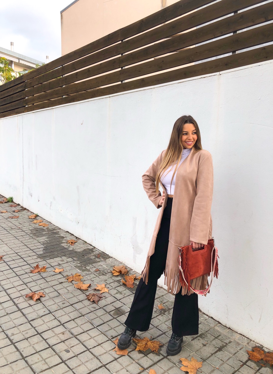 Abrigo de ante con muchos flequitos en la parte inferior, bolsillos y cinturón para poder abrochar con un nudo delantero.