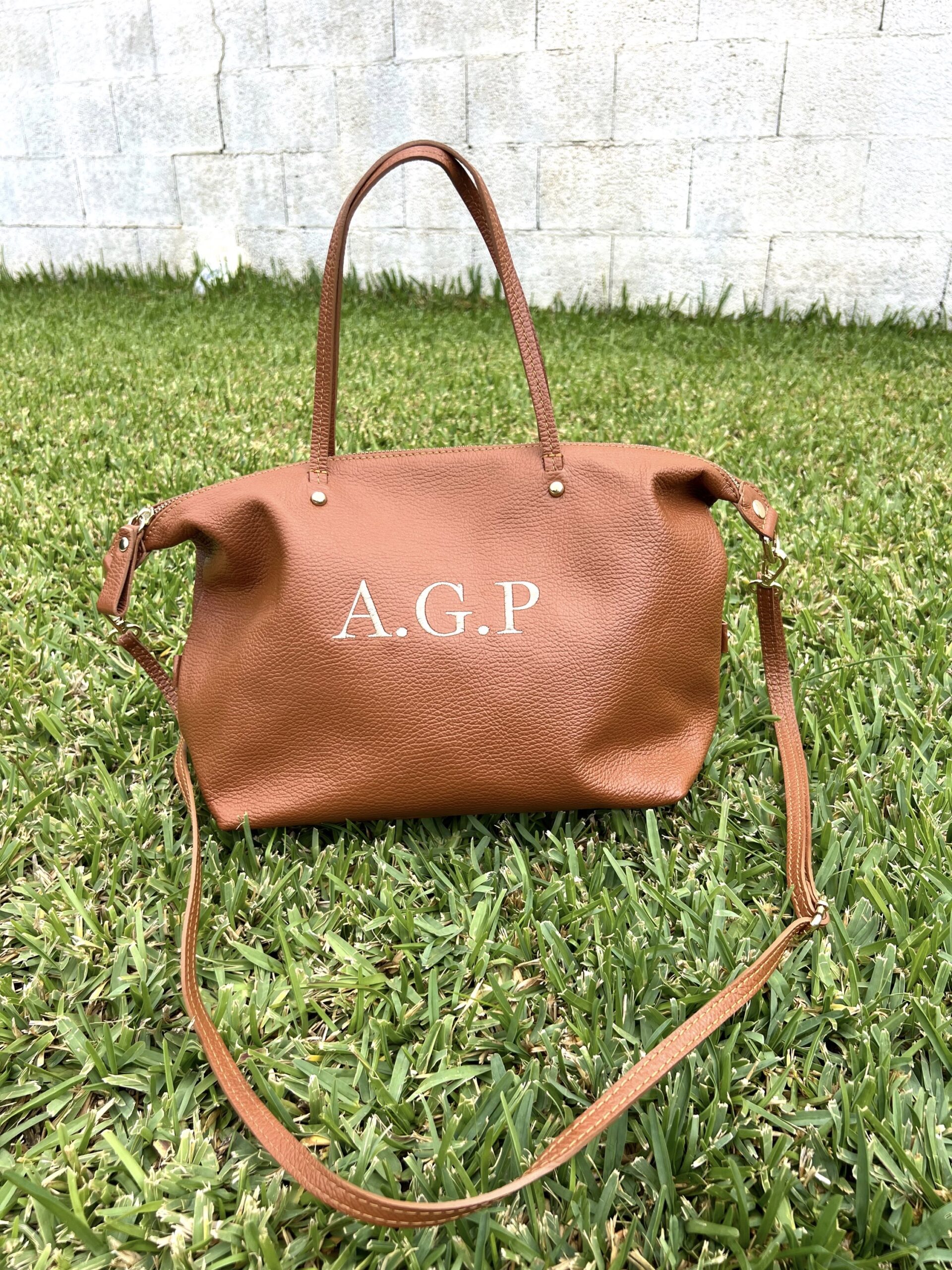 Bolso personalizado de piel y cierre en cremallera, con asa de mano y otra más larga del mismo color para llevar cruzado, con forro y bolsillos interior.