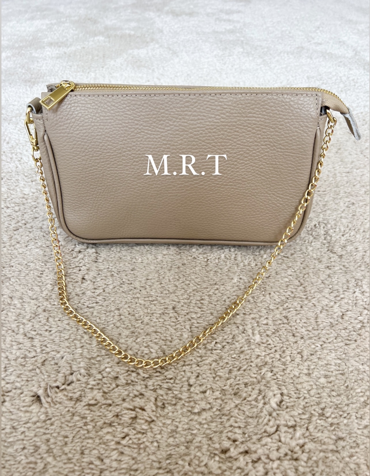 Bolso de piel con cierre de cremallera completo, contiene asa larga extraible del mismo color del bolso y otra más corta dorada. Las medidas son 20x15x10cm
