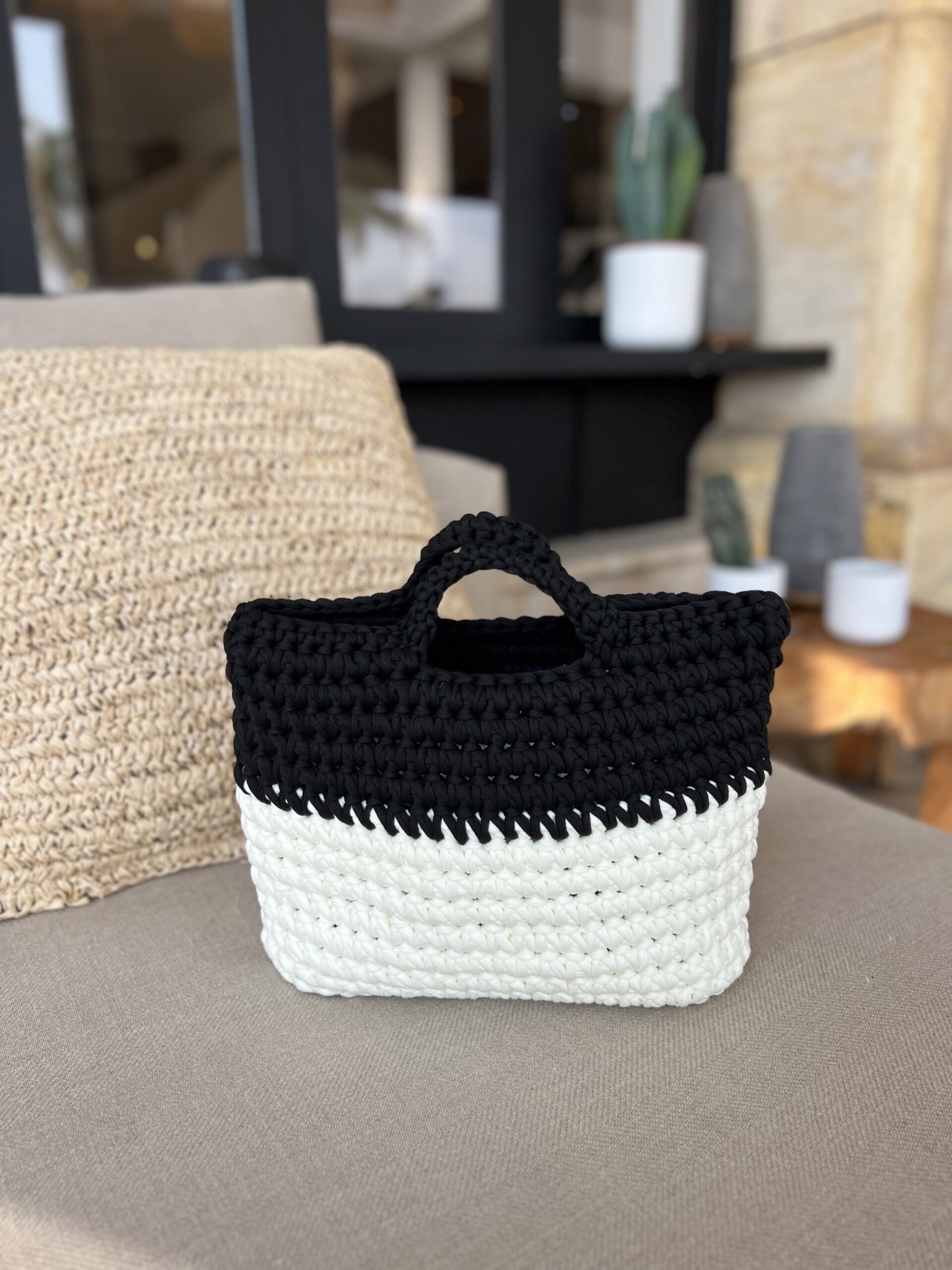 Bolso blanco hueso y negro de crochet hecho a mano. Con asa de mano y pompón del mismo color con anilla de color oro.