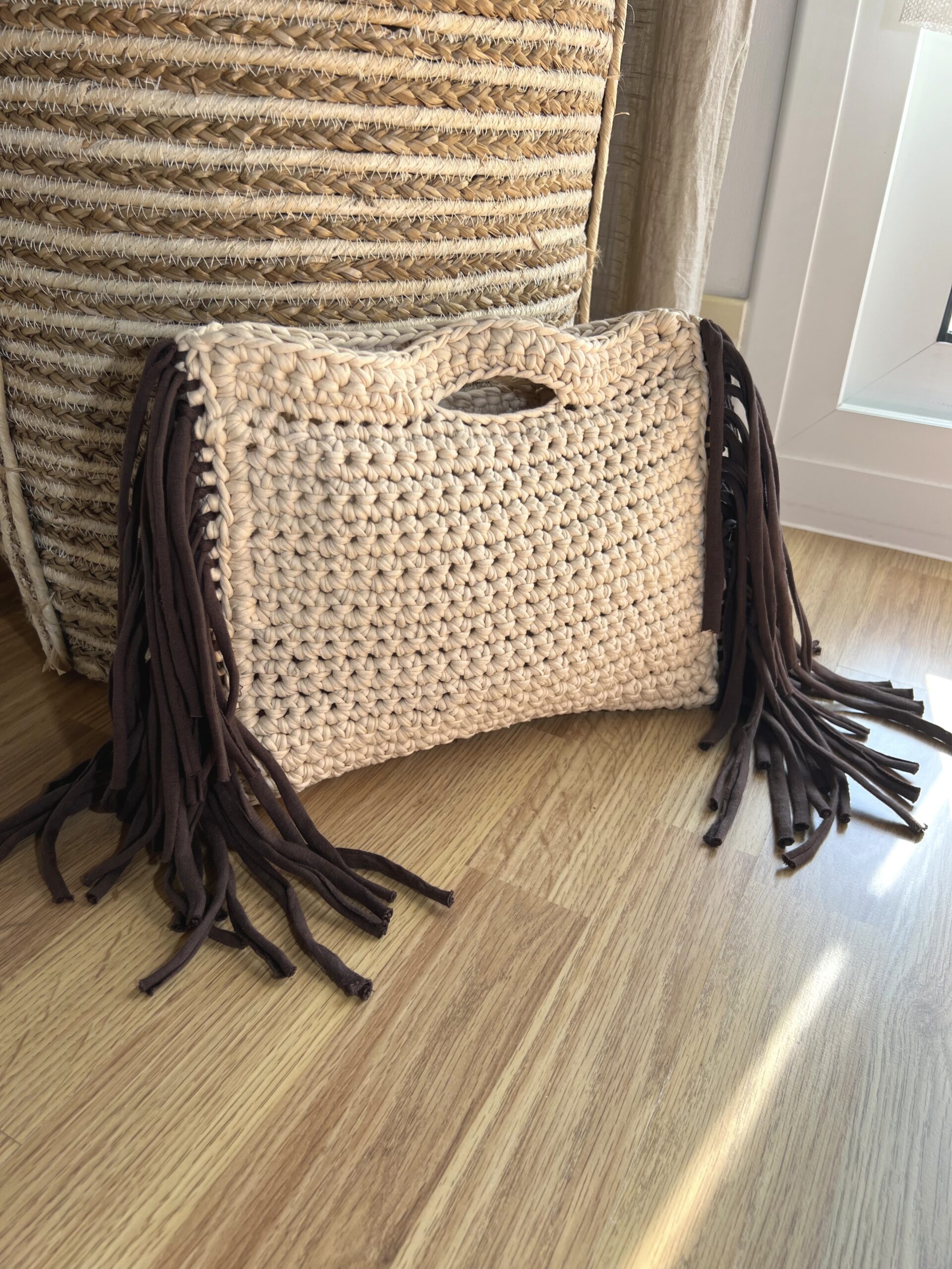 Bolso beige y marrón de crochet hecho a mano. Con asa de mano y pompón del mismo color con anilla de color oro.