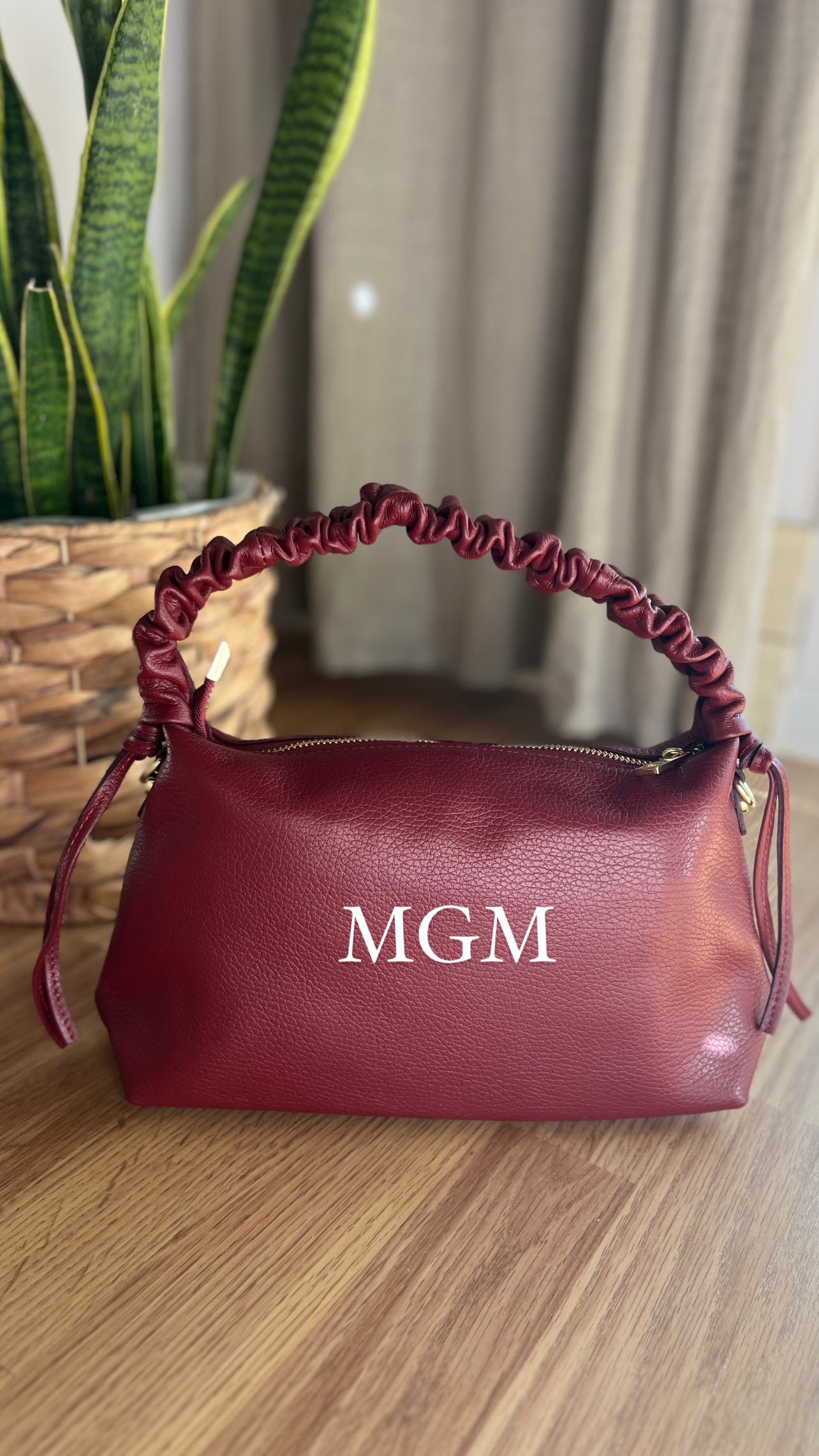 Bolso de piel con asa de rizo y cierre con cremallera, con correa larga que permite llevar el bolso a modo de bandolera.