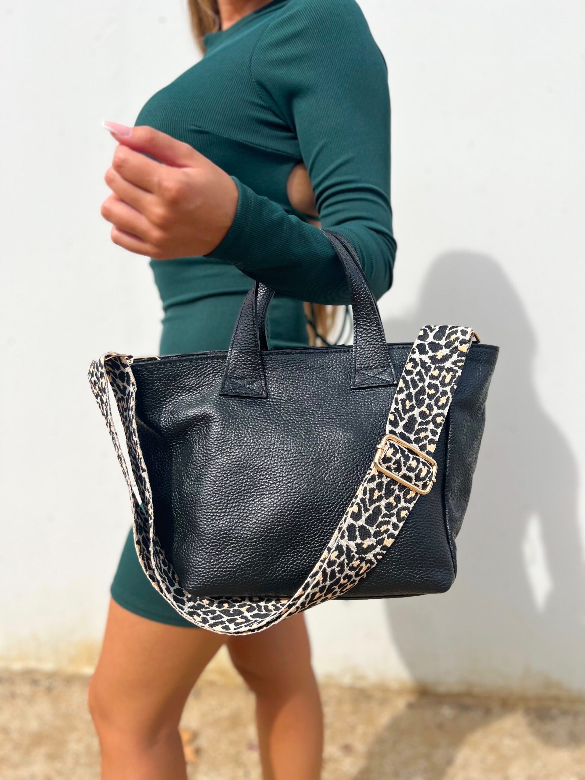 Bolso de piel con cremallera completa interior. Contiene doble asa, una corta y otra larga para llevar el bolso a modo de bandolera.