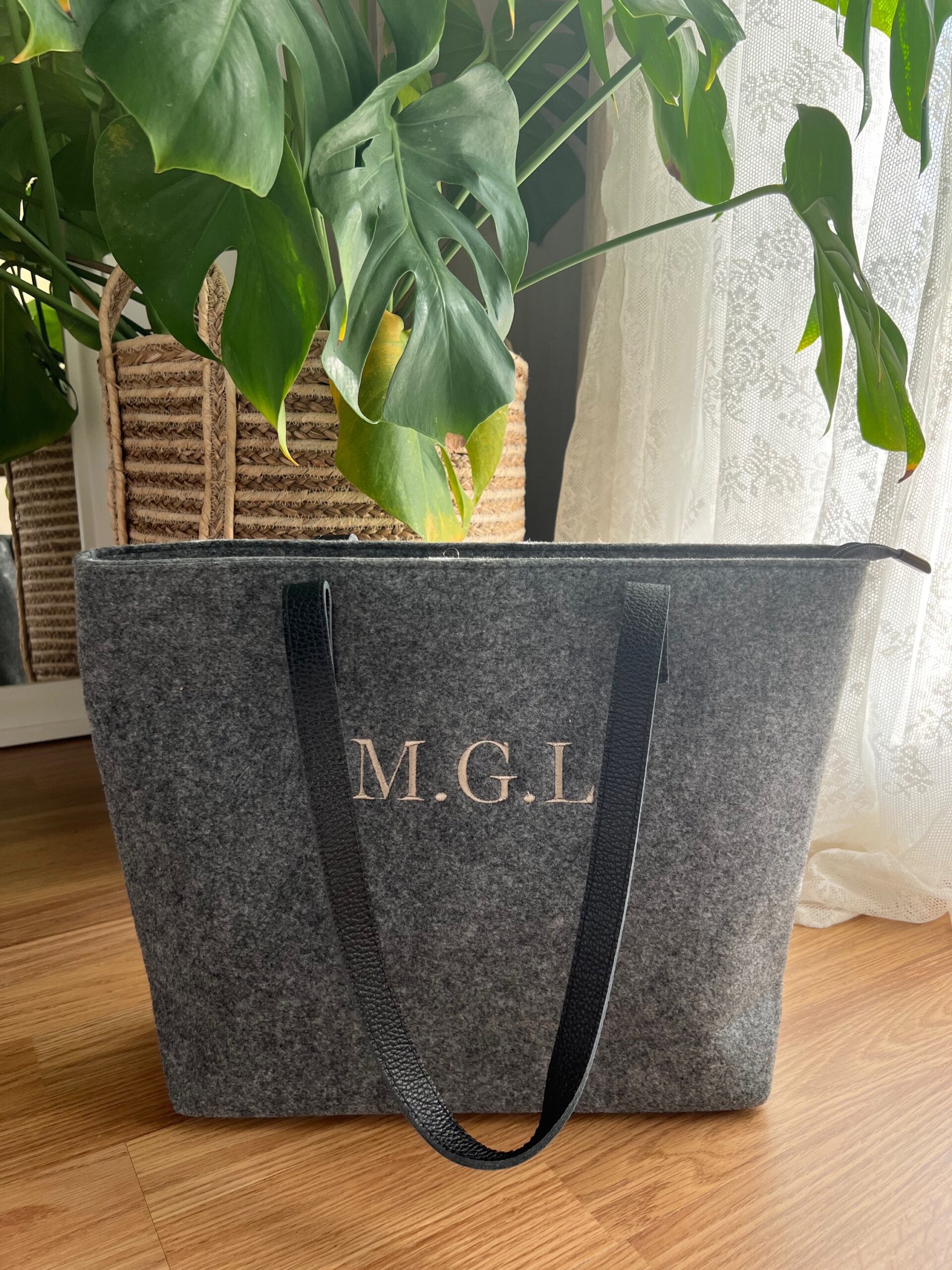 Bolso de fieltro y piel con cierre de cremallera y forro interior.