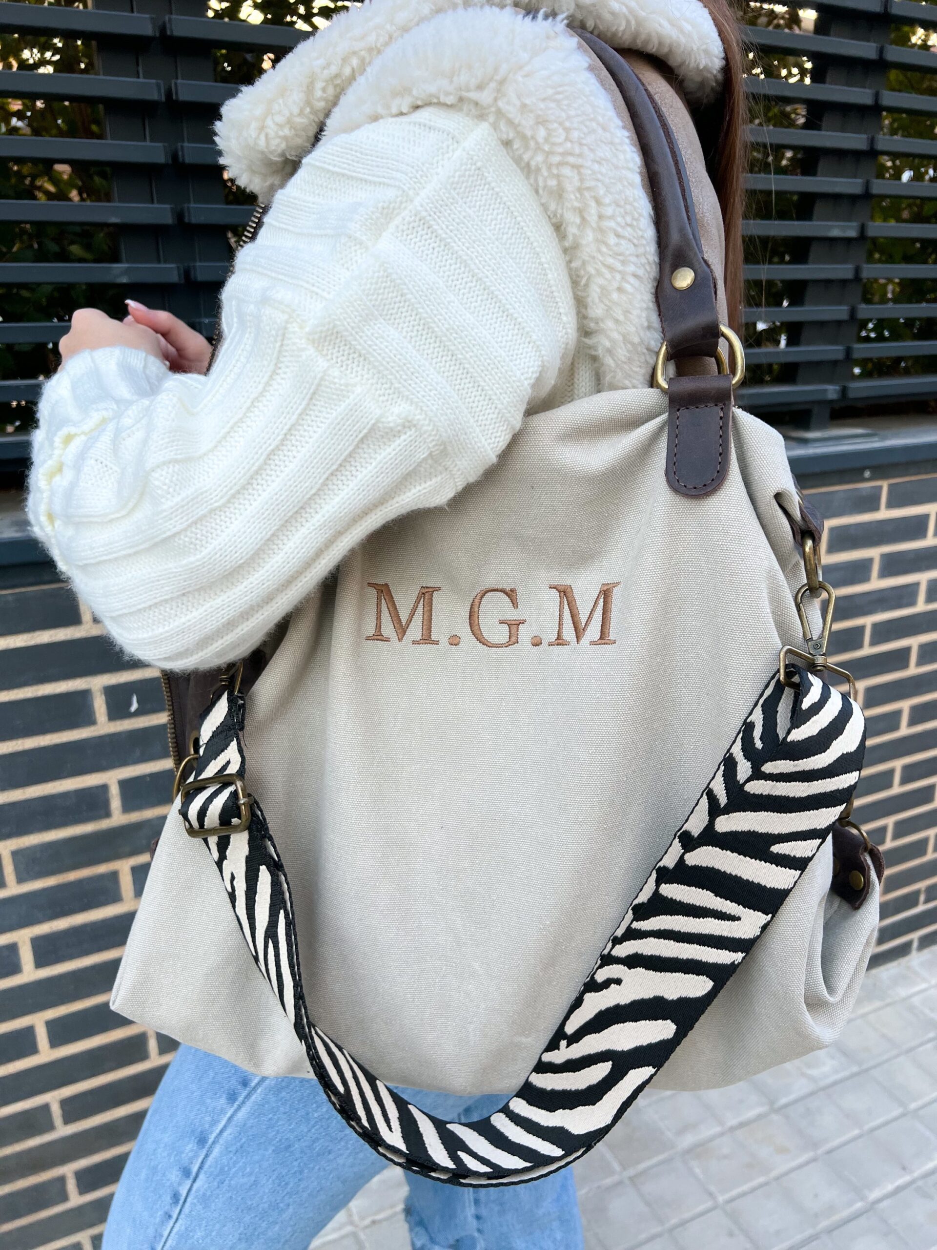 Doble asa corta de piel y otra marrón de tela extraible y regulable para hacerlo bandolera.