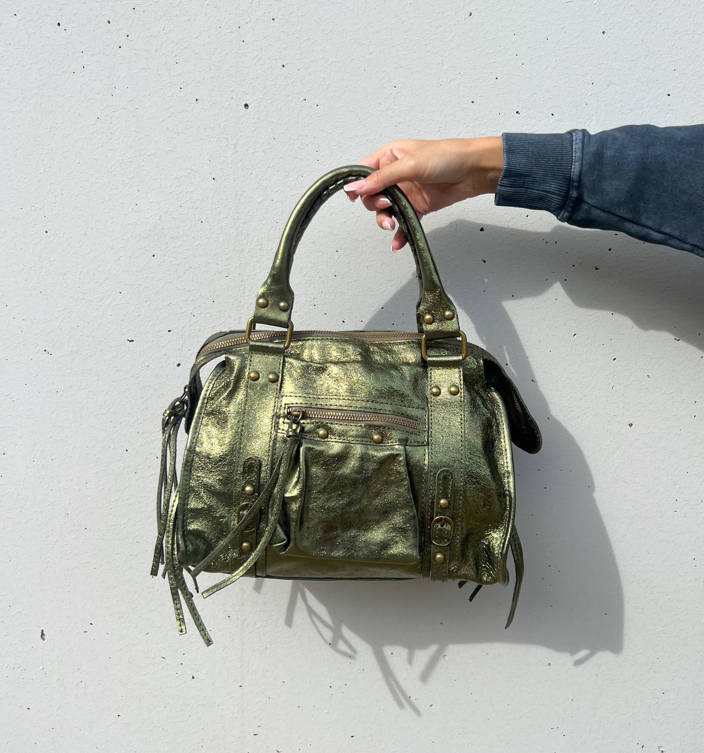 Bolso de piel metalizada con detalles de tachuelas.