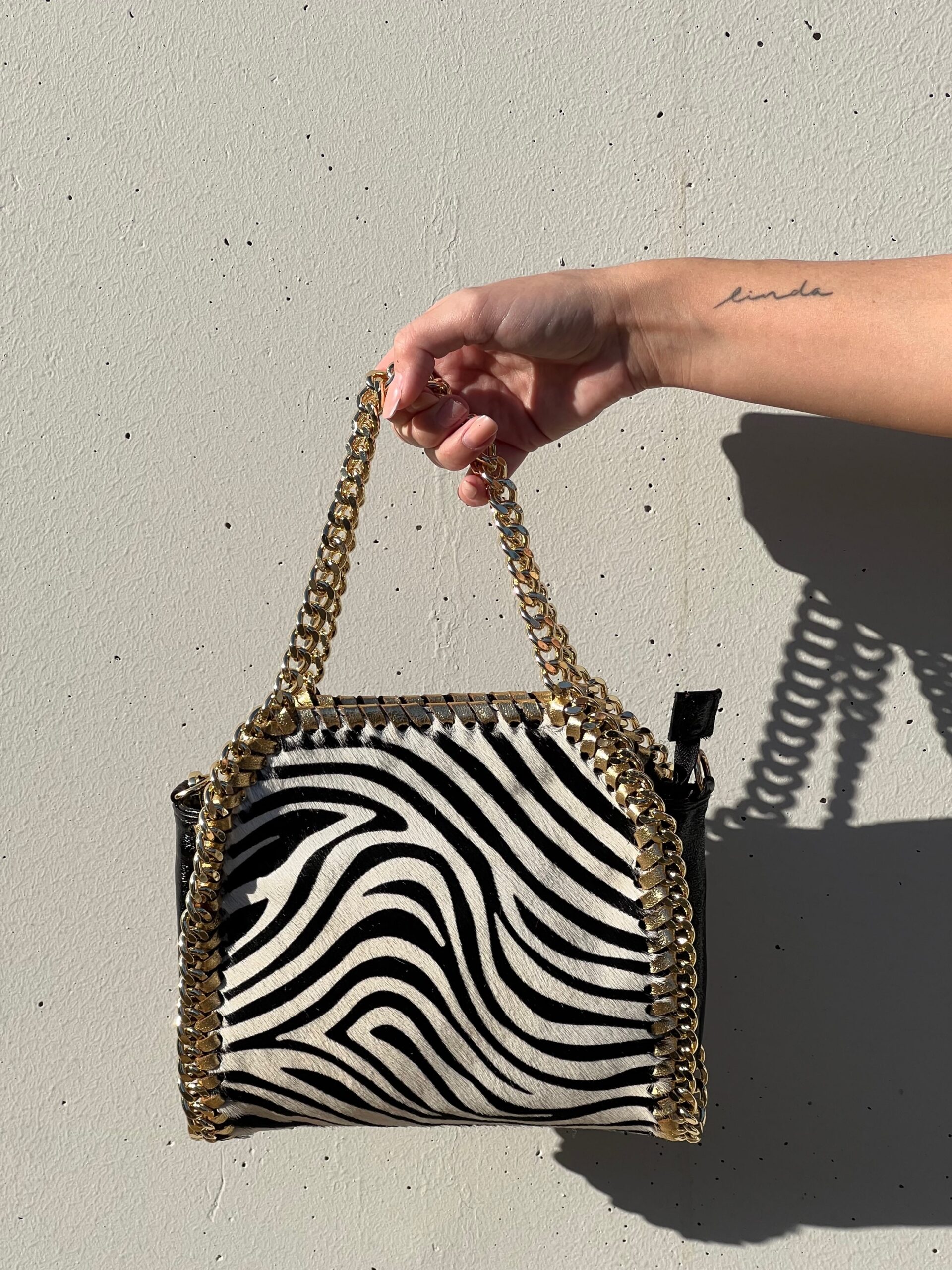 Bolso de pelito vegano por la parte delantera y piel por la parte trasera. Con asa de metal en dorado para llevar en la mano y otra asa larga para colgar el bolso a modo de bandolera. Cierre con cremallera.