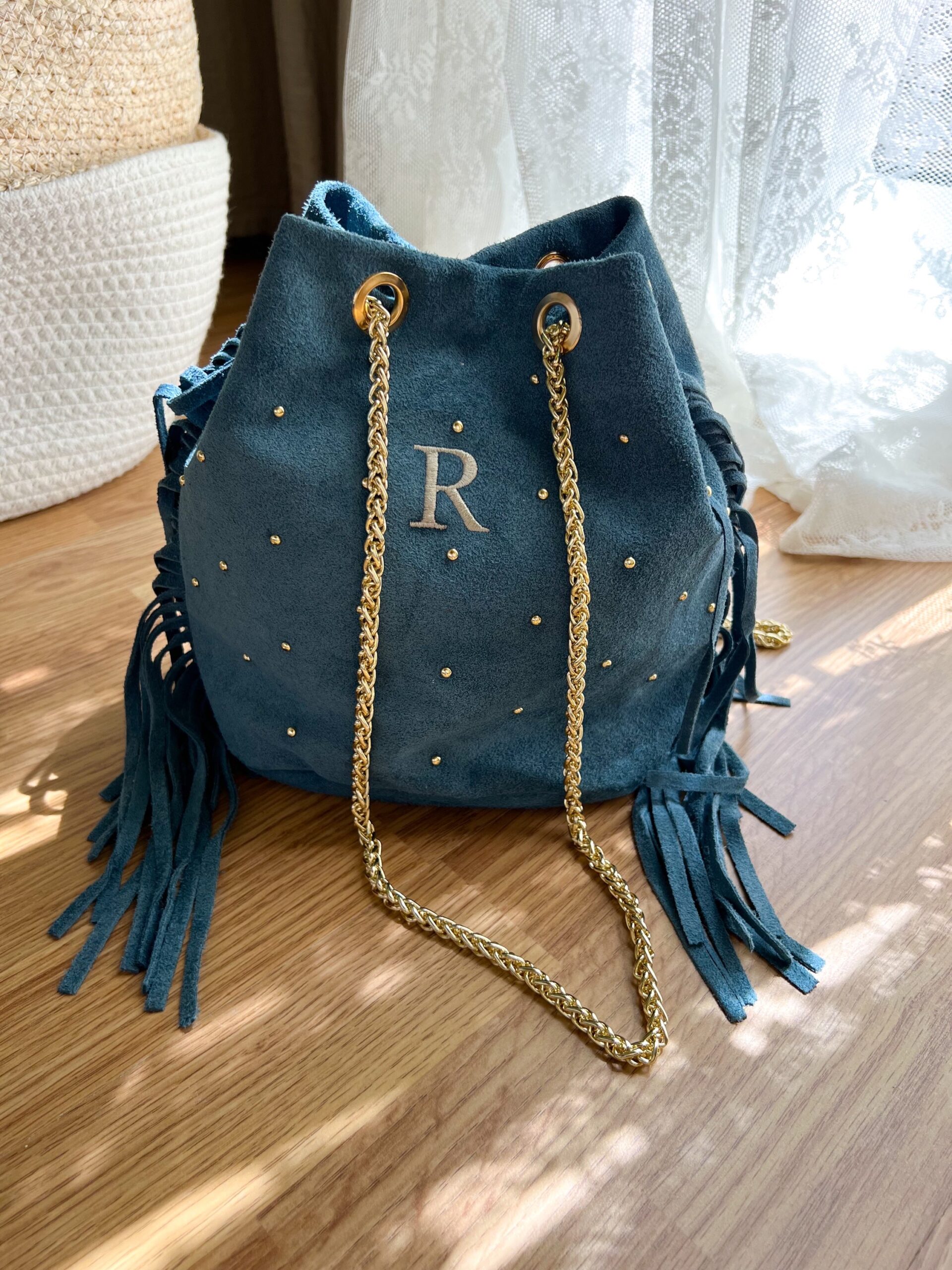 Bombonera de piel de melocotón con cadena en color dorado y detalles de tachuelas por todo el bolso del mismo color y flecos laterales.