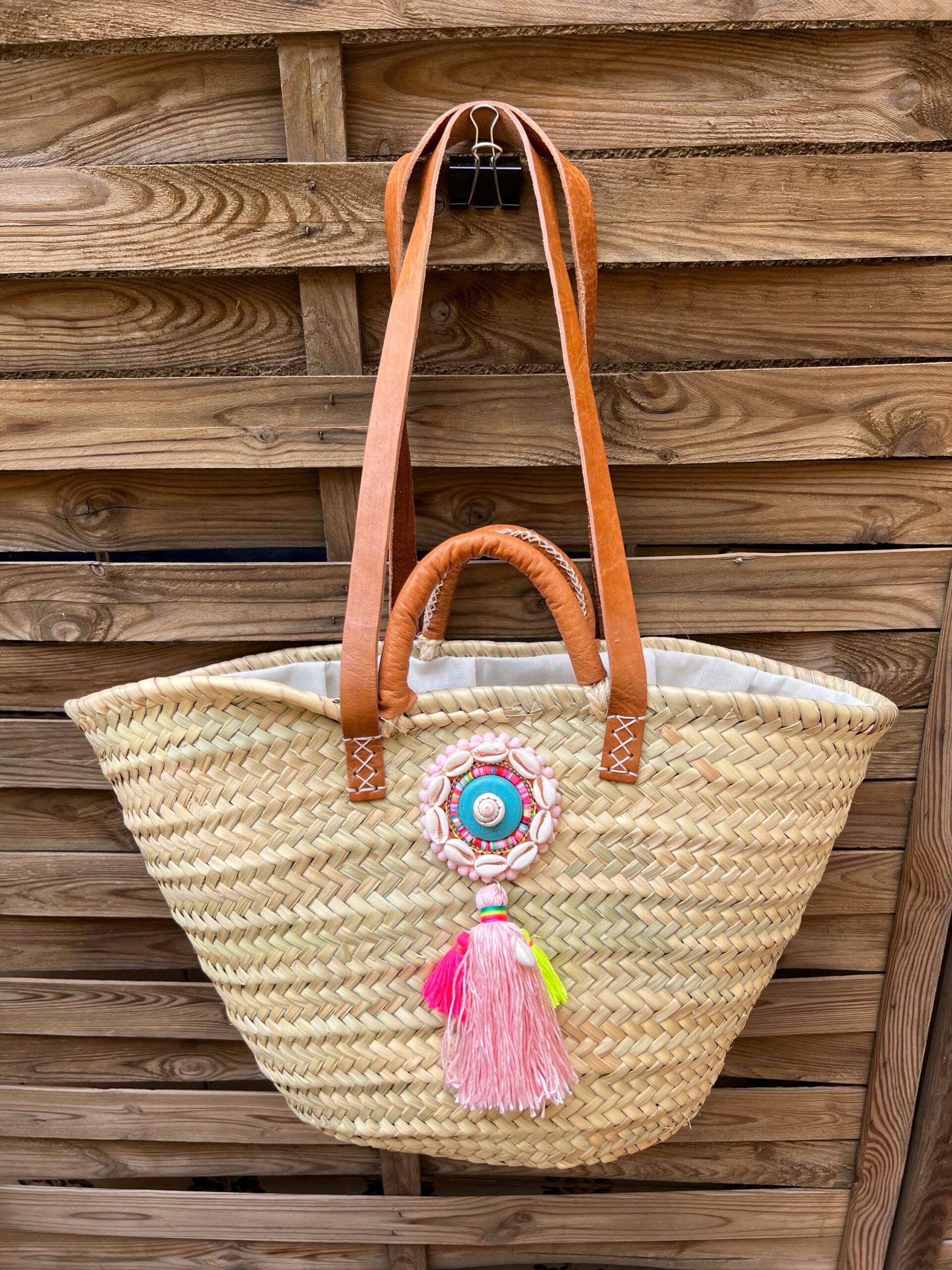 Capazo de mimbre hecho a mano con asas de cuero para llevarlo de mano o colgado.