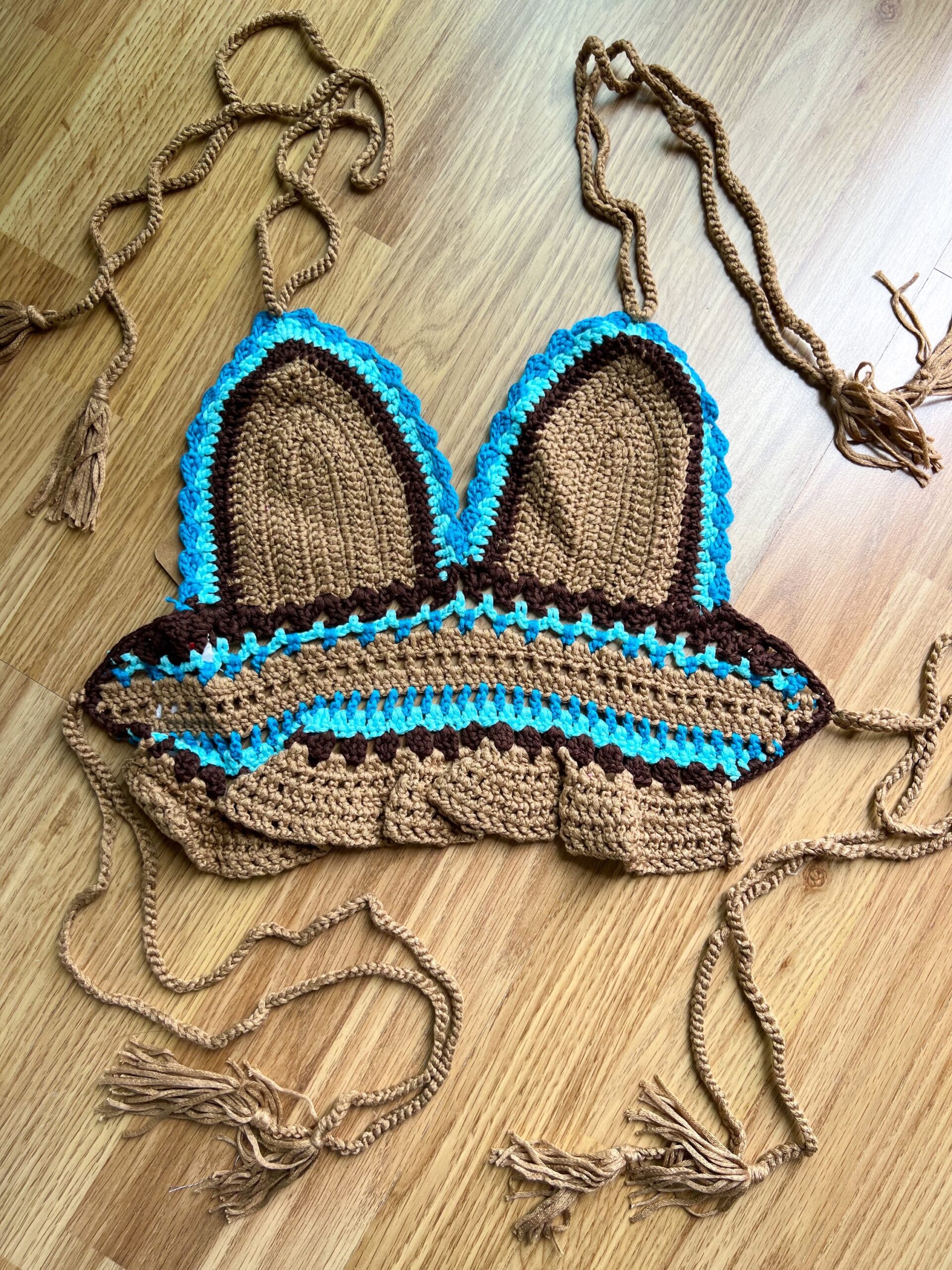 Crop top de ganchillo bicolor hecho a mano con volantes y escote en pico.