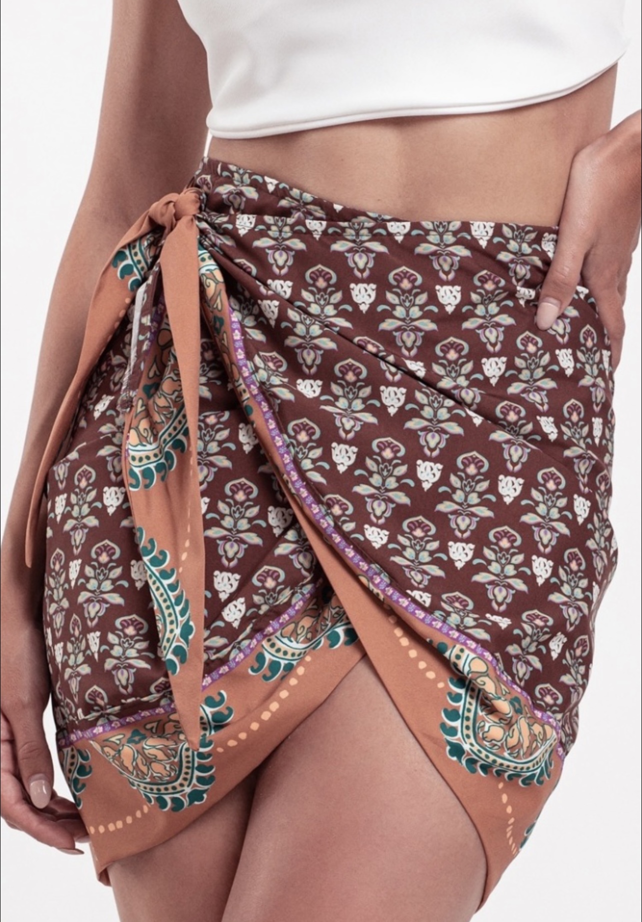 Falda pareo cruzada con lazo lateral de estampado etnico.