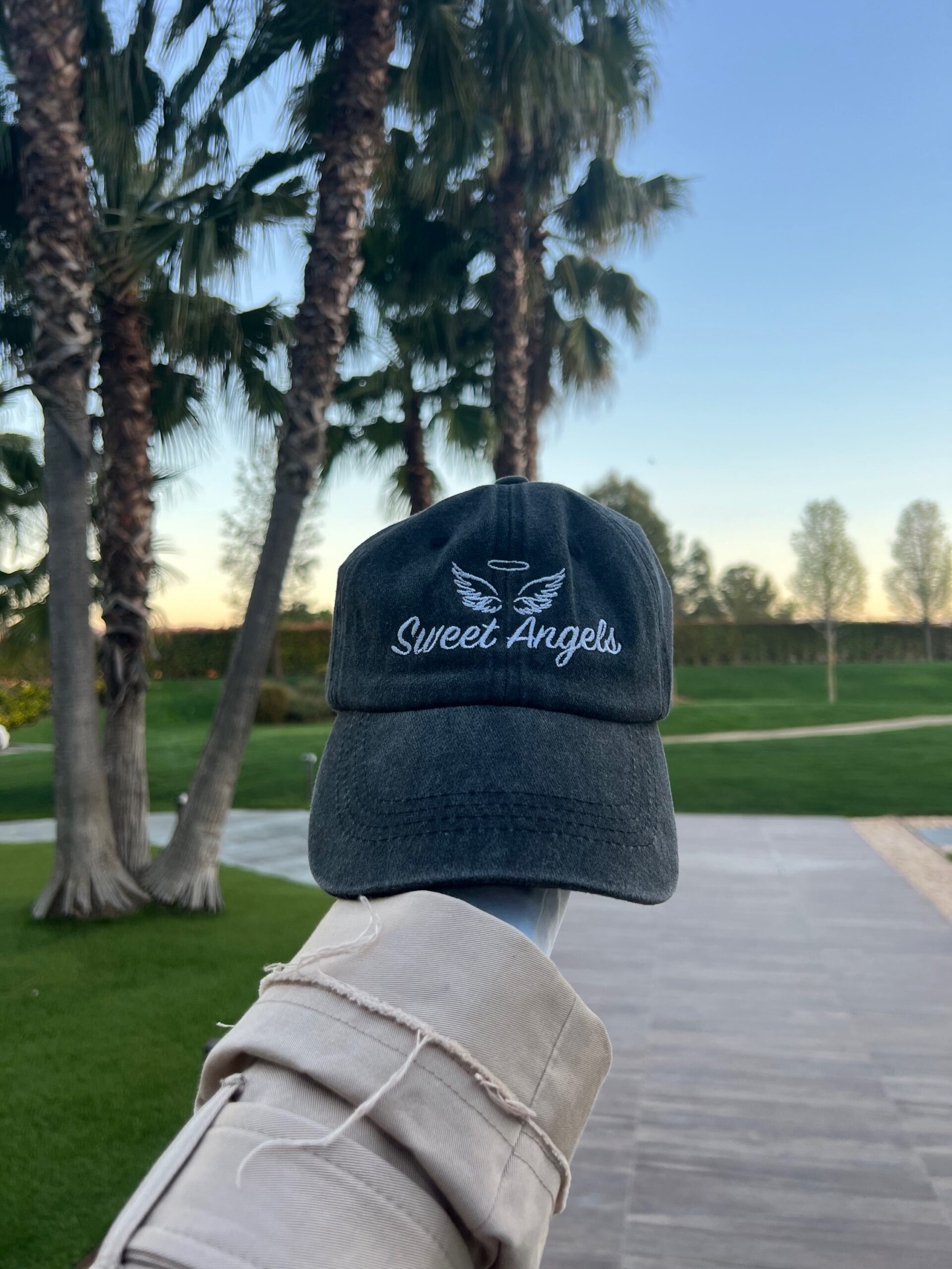 Gorra tejana efecto desgastado con el logo de “Sweet Angels” bordado en color blanco.