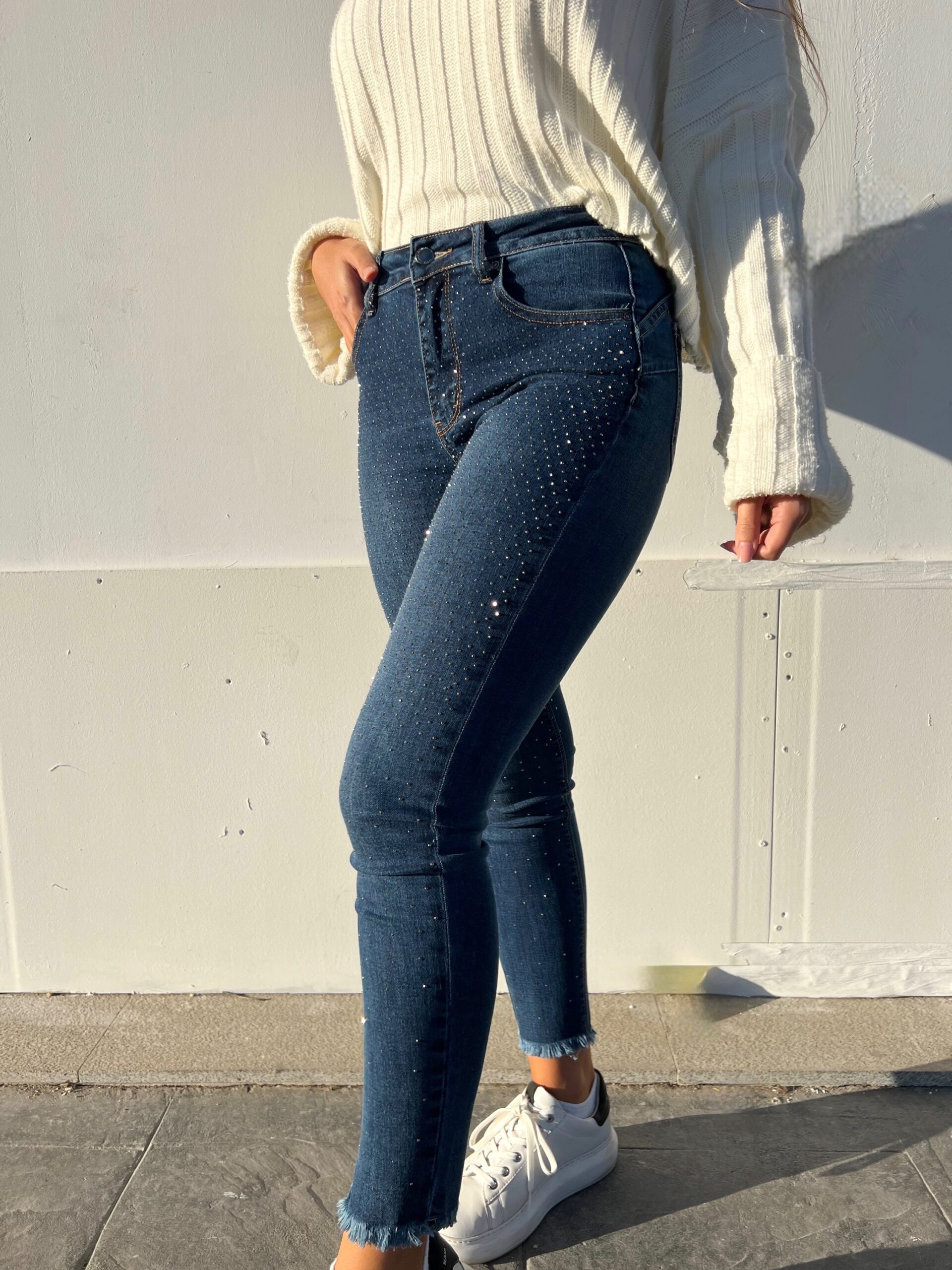 Tejanos elásticos con detalle de brillos delanteros, pitillo con acabado despuntado y efecto push up.