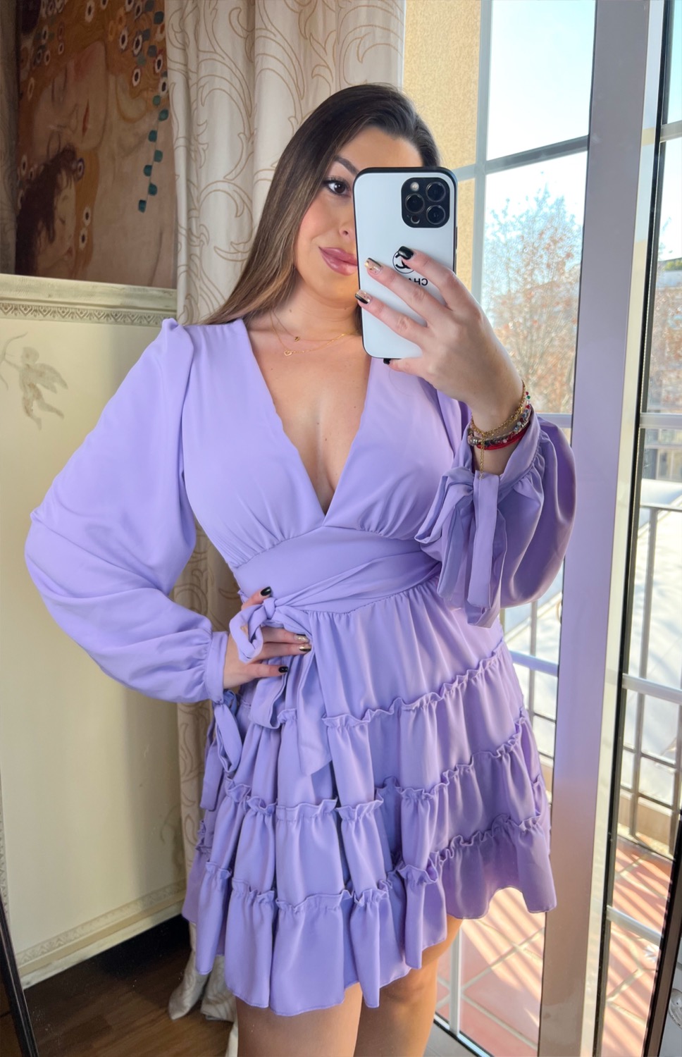 Vestido mini con volantes de mangas abullonadas y lazada al final. Ajustado en la cintura con lazo y goma, escote en forma de V.
