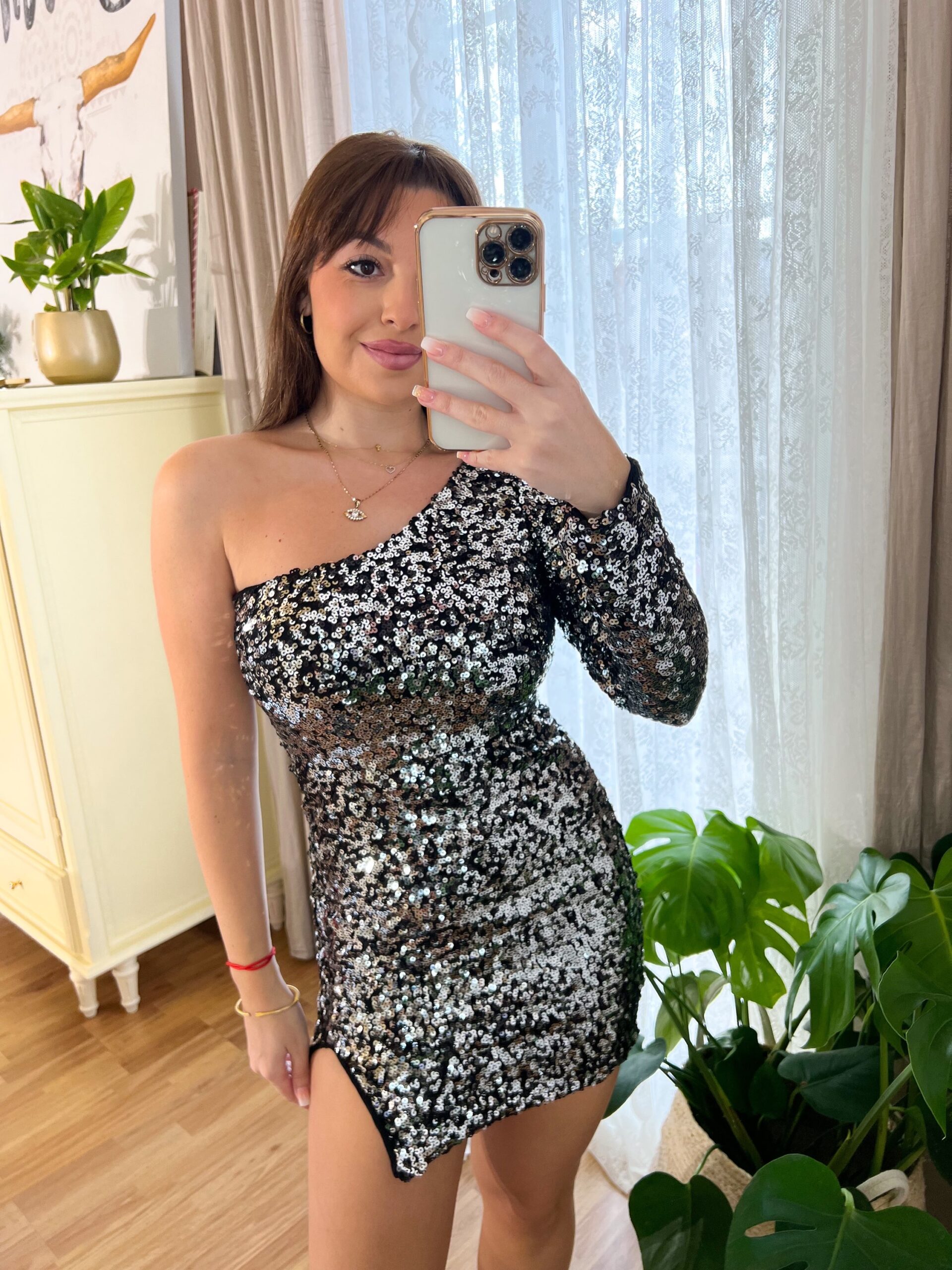 Vestido asimétrico de lentejuelas con detalle de apertura.
