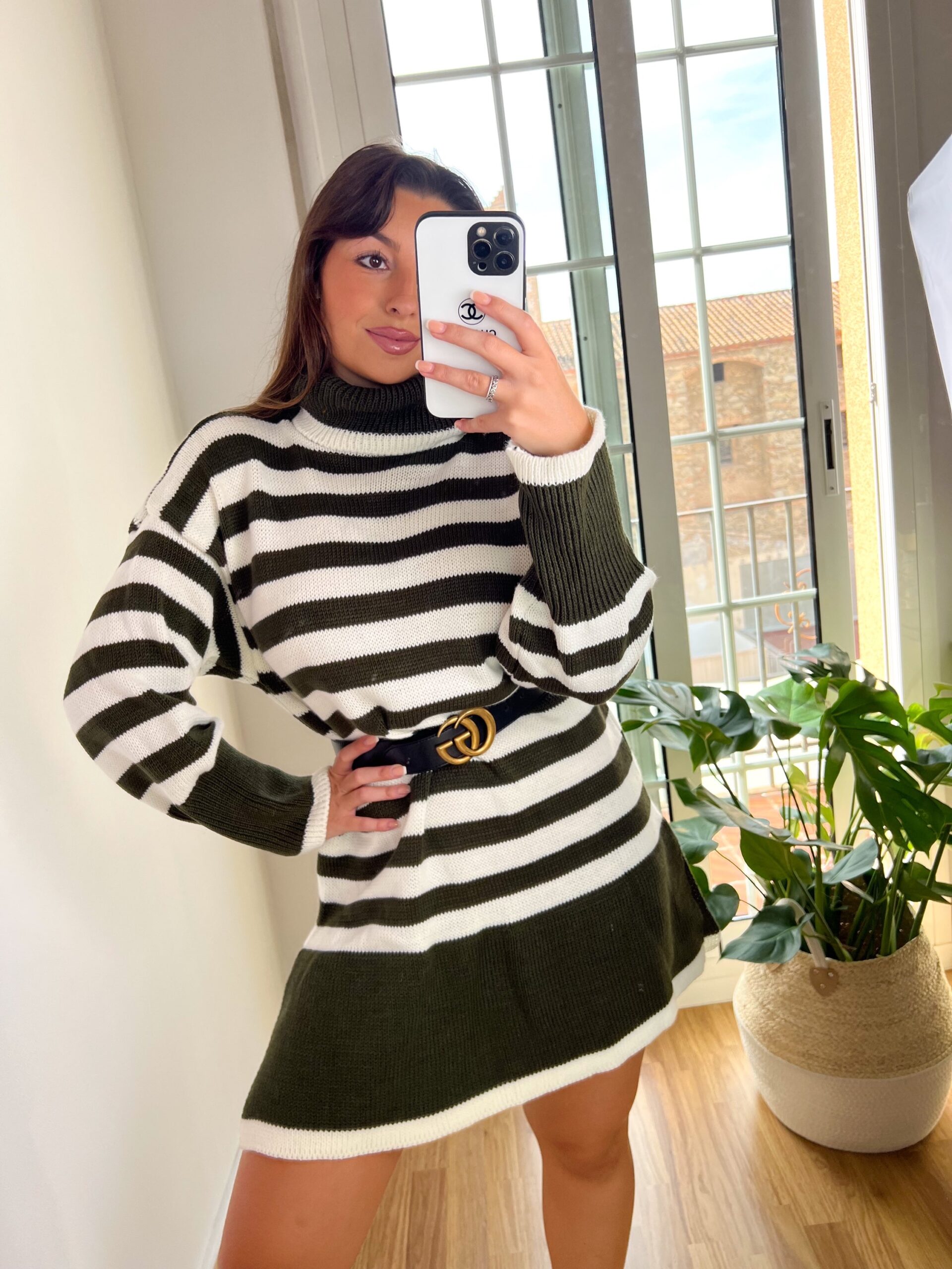 Vestido midi de punto a rayas con cuello alto y detalle de aperturas laterales.