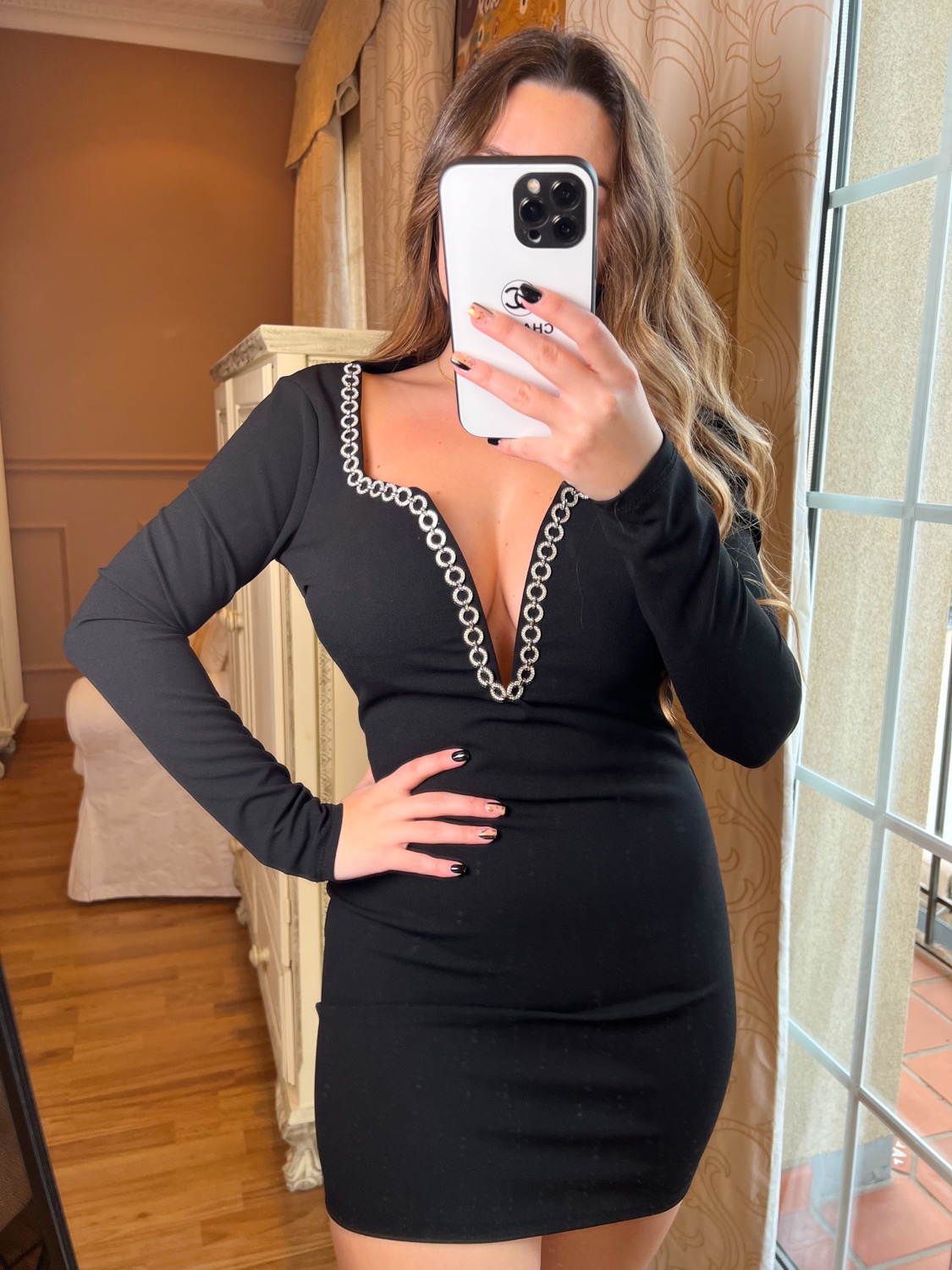 Escote en V pronunciado con detalle de cadena brillante plateada y cremallera invisible trasera.